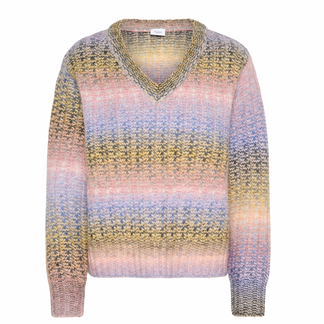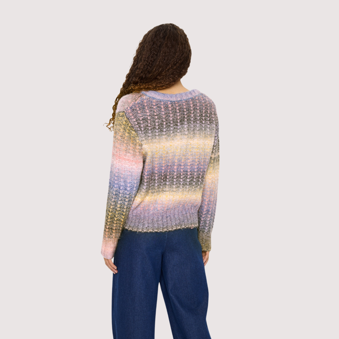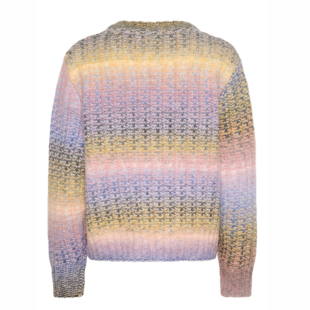 Pull en maille à rayures horizontales multicolores dans des tons doux de lilas, bleu, jaune, rose et vert.