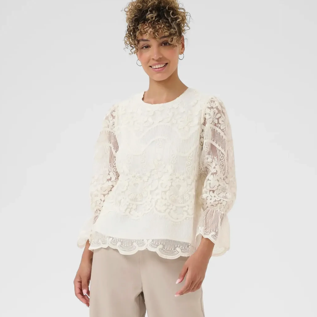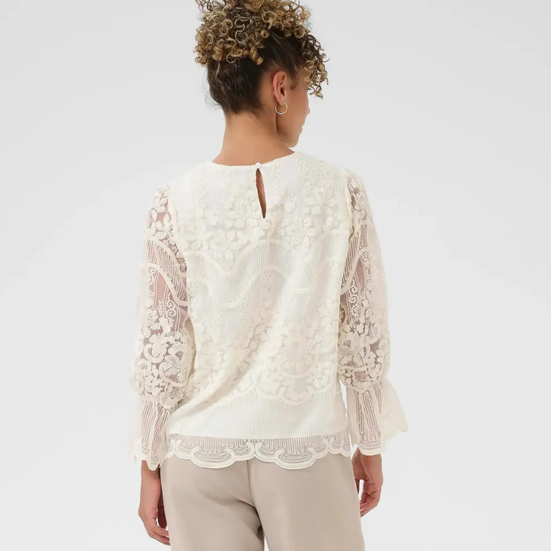 De délicats détails en dentelle et des manches subtilement bouffantes définissent cette élégante blouse. Son tissu léger épouse parfaitement la silhouette et la met en valeur. Une pièce polyvalente, idéale pour une tenue habillée ou décontractée.