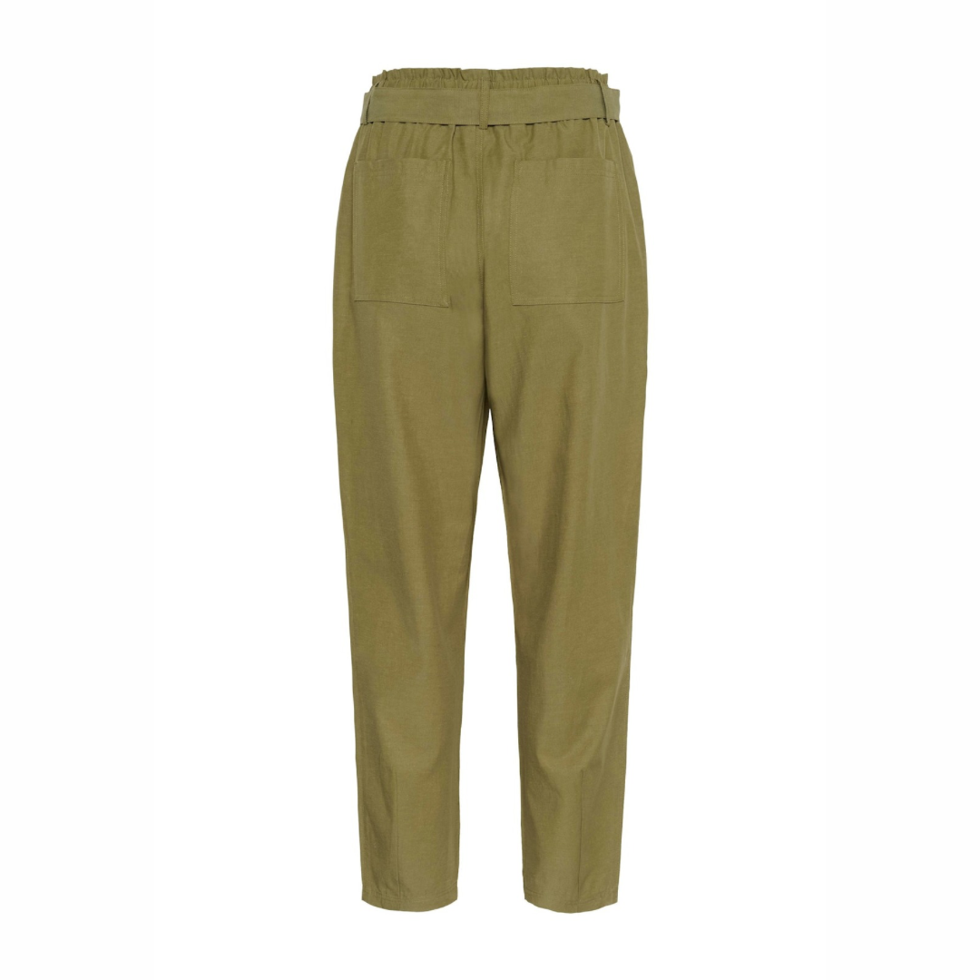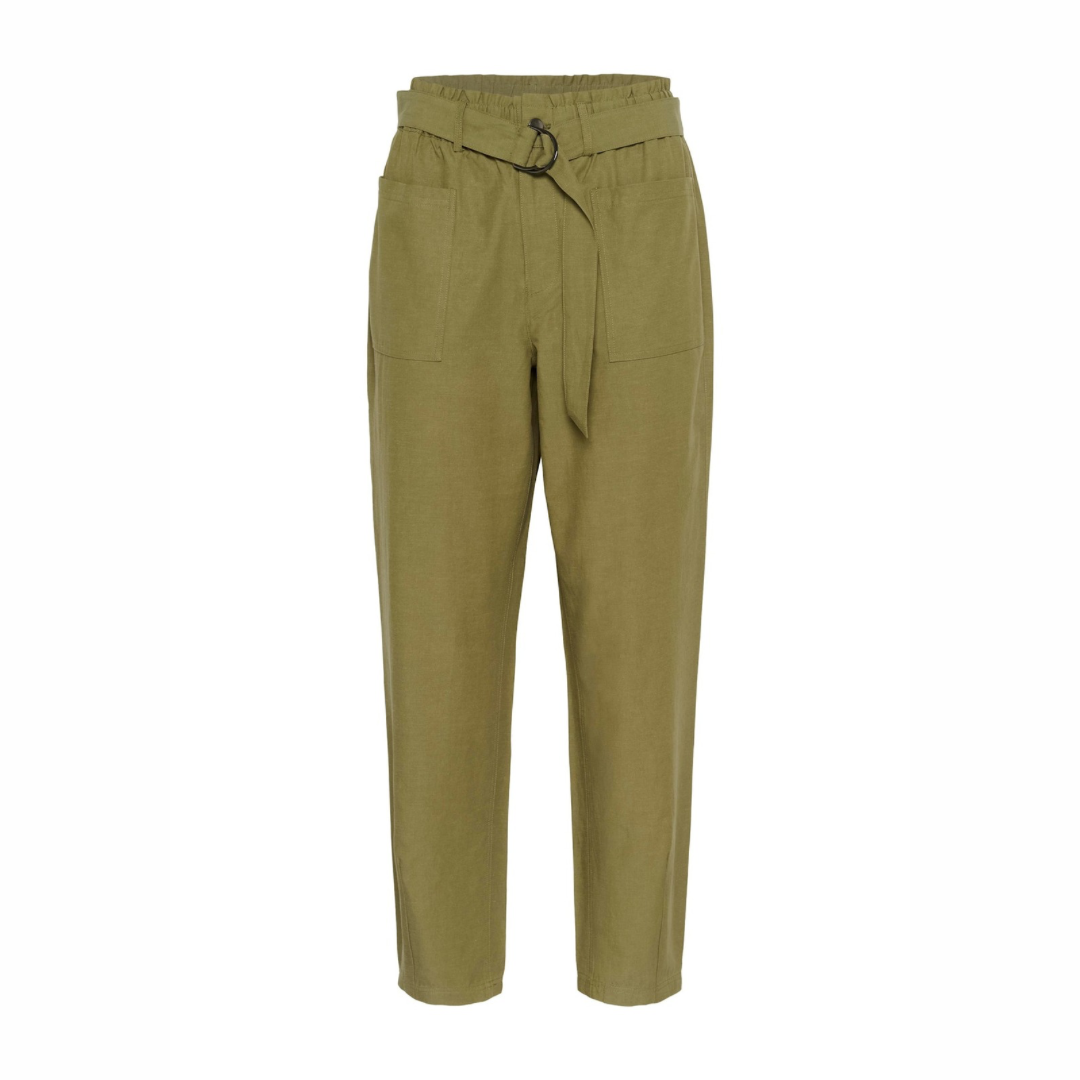 Ce pantalon à taille haute est doté d'une ceinture élastique froncée et d'une boucle en D. Sa coupe droite offre une silhouette décontractée. De grandes poches plaquées à l'avant ajoutent une touche pratique. Le tissu présente un fini mat légèrement texturé.
