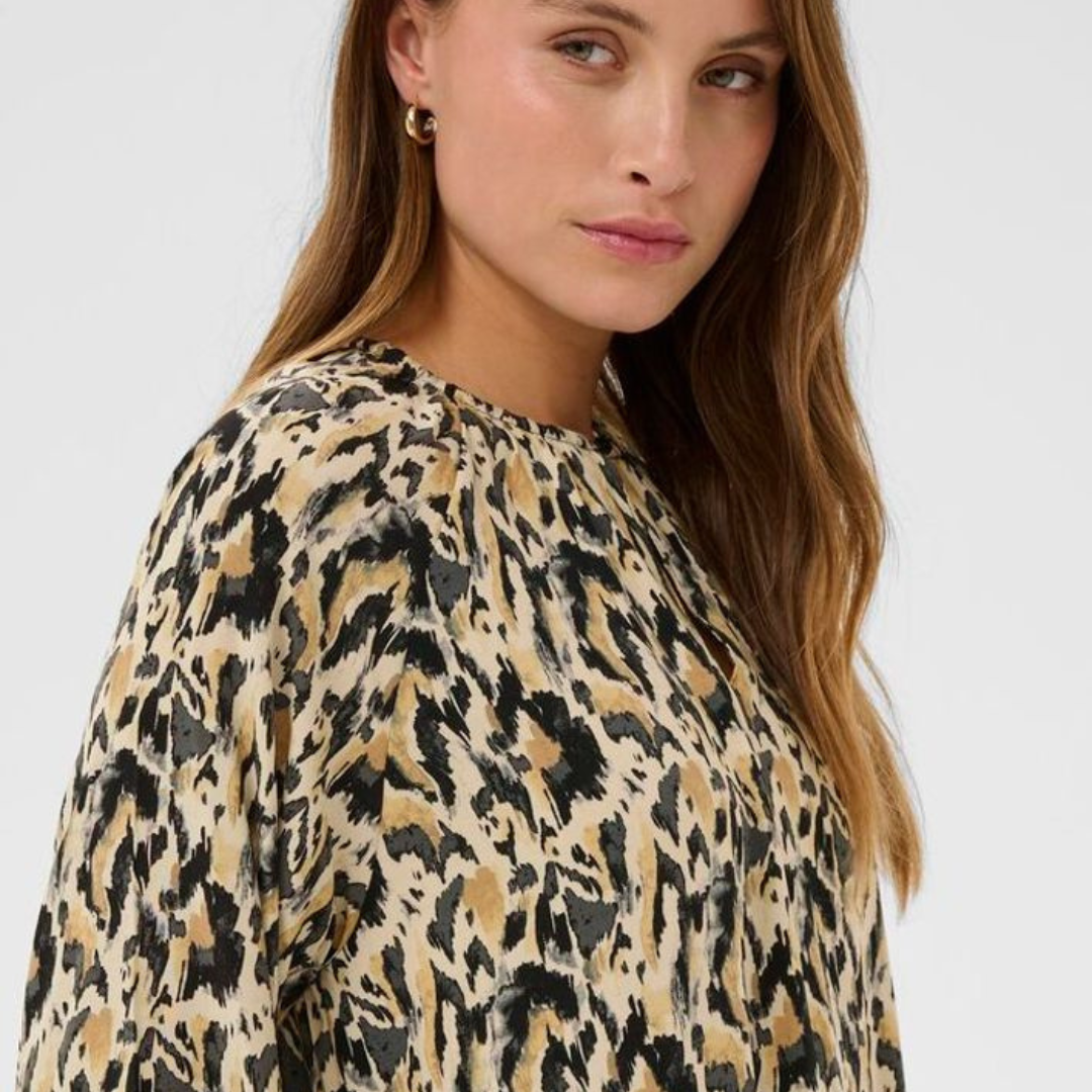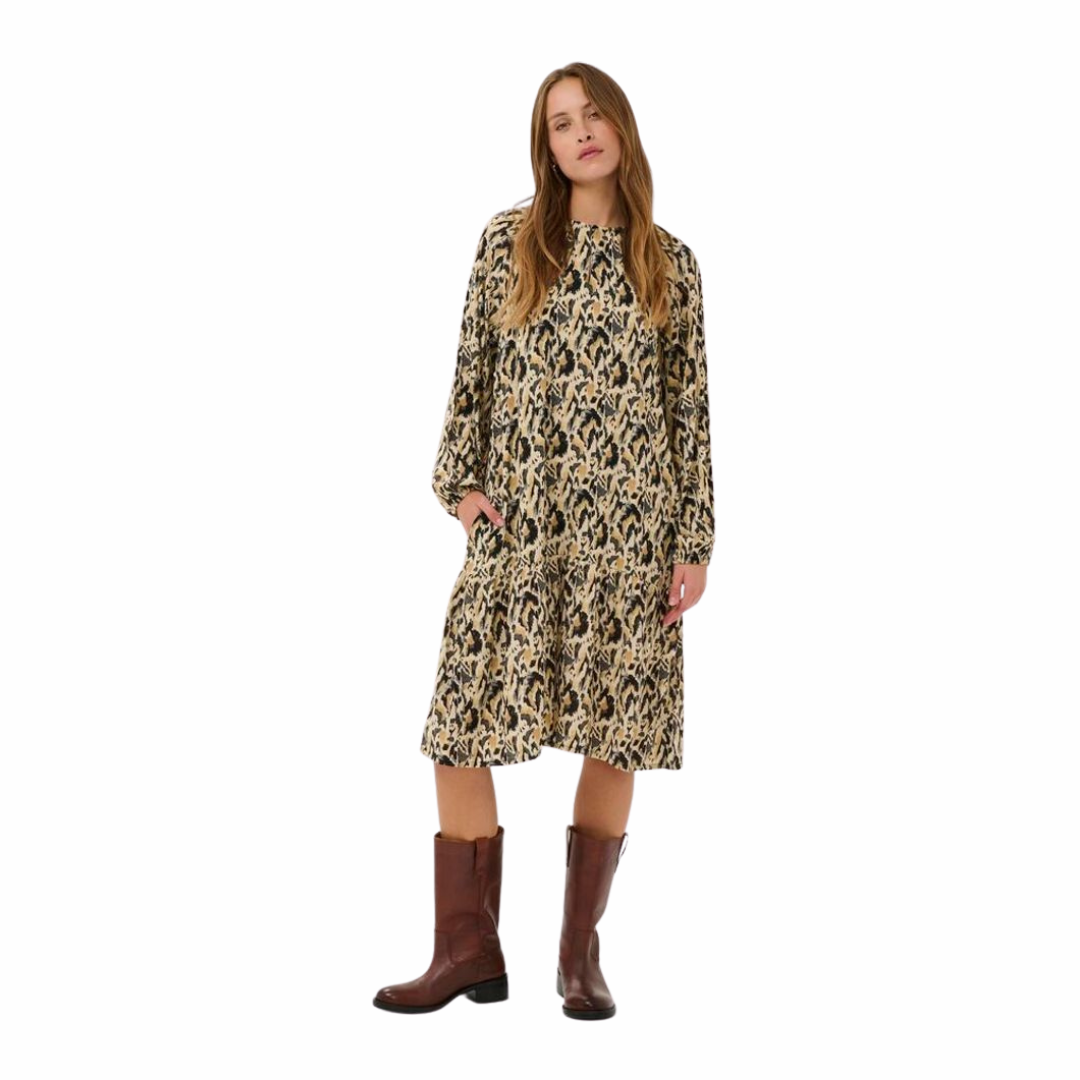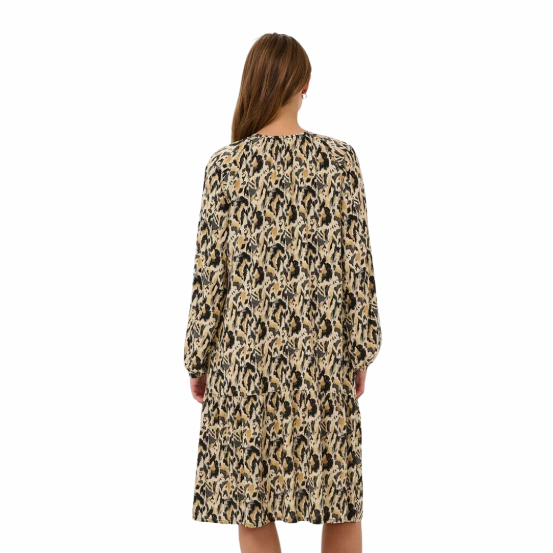 Cette robe à la coupe ample et droite présente un col rond froncé et de longues manches fluides. Elle arrive au genou et arbore une couture discrète à la hanche. Sa texture douce et fluide est visible sur l'ensemble du tissu.