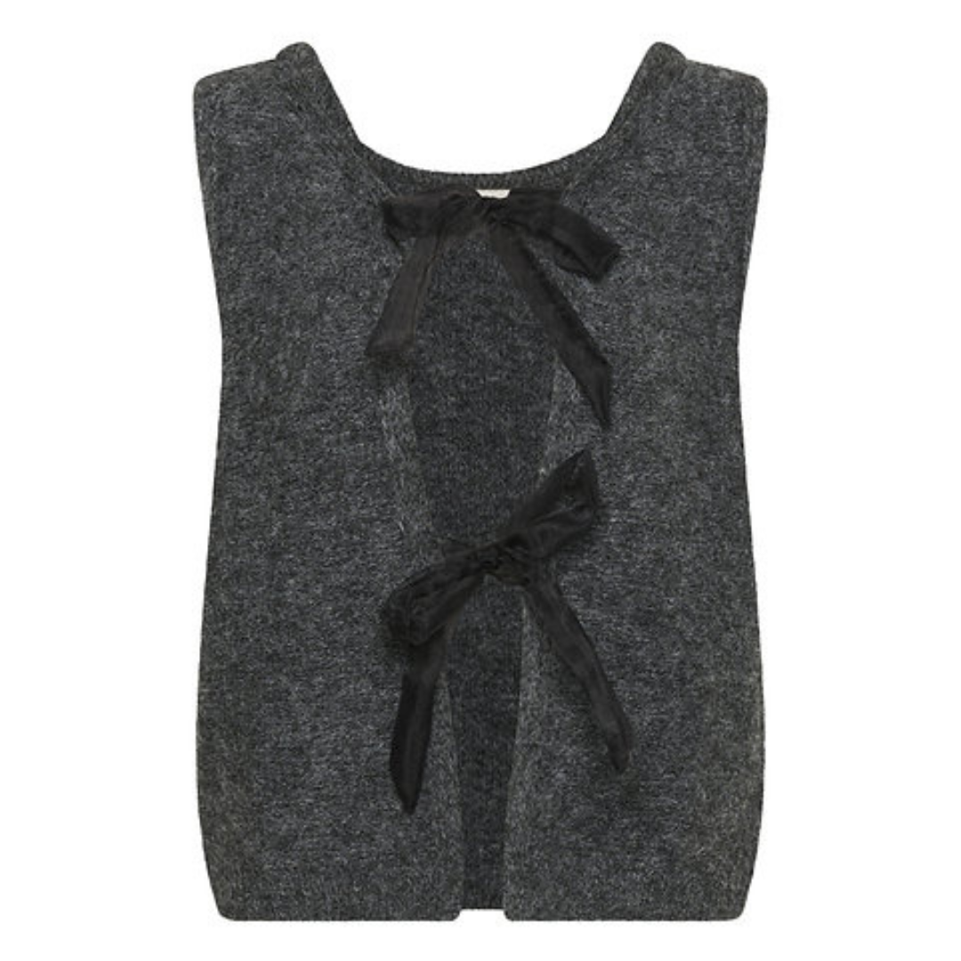 Pull court en maille Bulp gris avec nœud sur le devant. Peut se porter avec une fermeture dans le dos.
