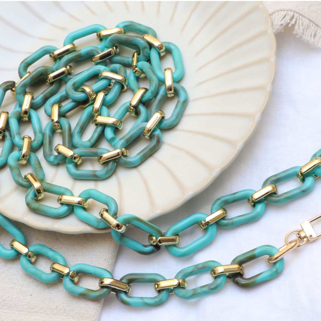 Chaîne bandoulière pour sac composé d'anneaux en laiton doré et d'anneaux en acétate coloré. Pratique et amovible, les fixations se réalisent facilement grâce aux deux mousquetons tournants. Longueur chaîne : 120 cm Dimensions des mousquetons : 12 x 20 mm Garantie sans nickel, sans cadmium et sans plomb.