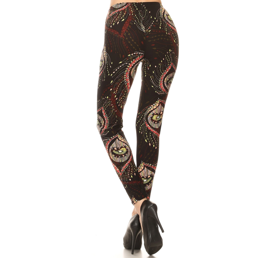 Description: Imprimé abstrait de plumes de paon, taille haute élastique, legging en tricot extensible sur toute la longueur.