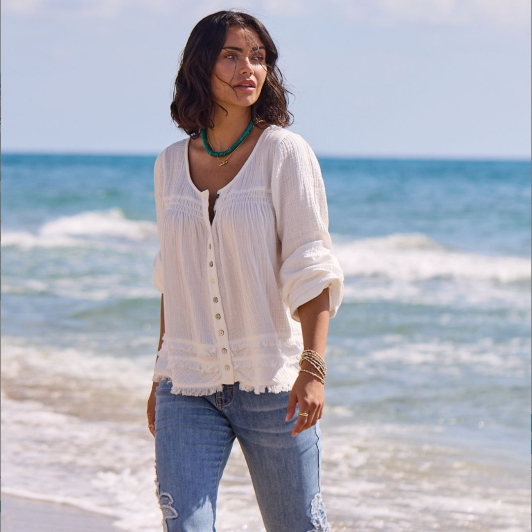 Découvrez l'élégance intemporelle de cette blouse en coton gaze, parfaite pour les journées chaudes et les soirées décontractées. Le motif tribal ajoute une touche d'originalité et de caractère à votre garde-robe. Confectionnée en tissu léger et respirant, elle offre un confort optimal tout en mettant en valeur votre silhouette. La fermeture boutonnée permet un ajustement personnalisé et facilite l'enfilage. Polyvalente et intemporelle, cette blouse devient rapidement un incontournable de votre collection estivale.