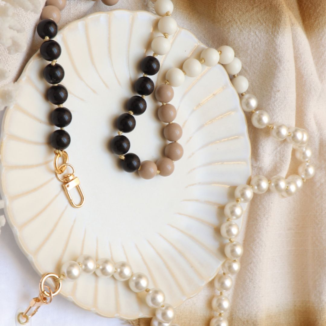 Chaîne bandoulière pour sac composé d'anneaux en laiton doré, d'un cordon et de perles colorées en forme de boule. Pratique et amovible, les fixations se réalisent facilement grâce aux deux mousquetons tournants. Longueur chaîne : 120cm Dimensions des mousquetons : 12 x 20 mm Garantie sans nickel, sans cadmium et sans plomb.
