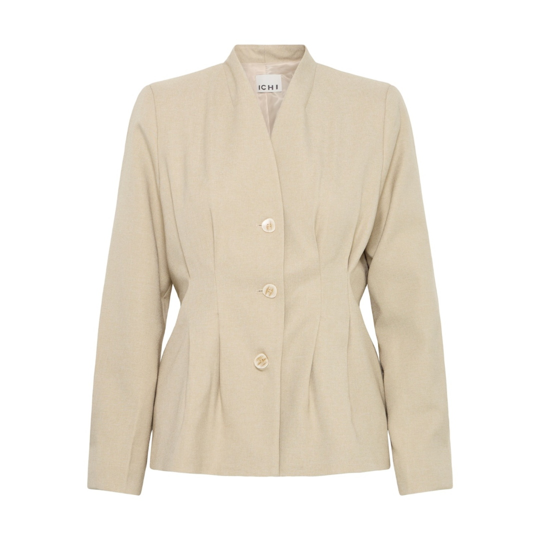 Ce blazer cintré présente une taille marquée, un décolleté en V et des épaules structurées, le tout agrémenté d'une fermeture à trois boutons et de subtils plis sur le devant pour une silhouette élégante et raffinée.