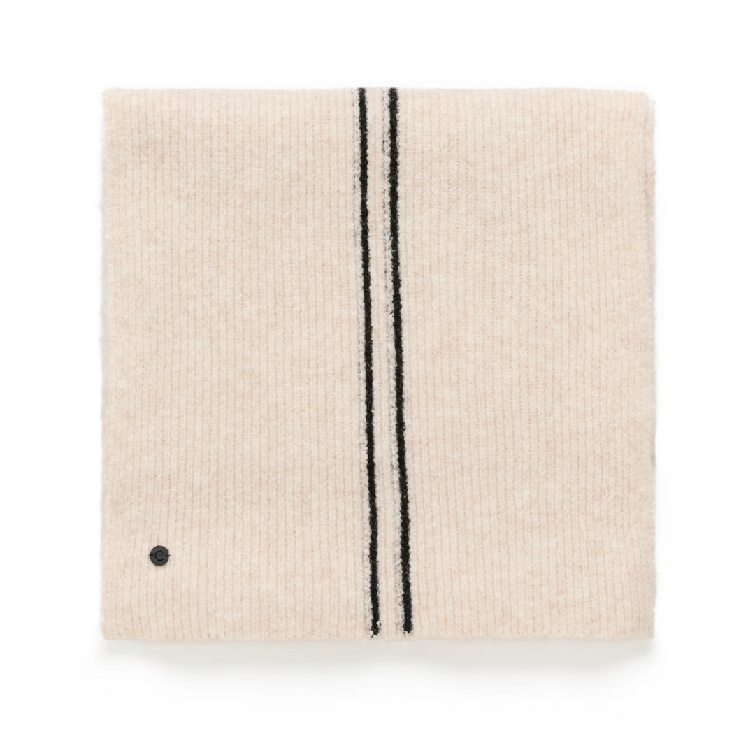 Ce foulard, doux et généreusement enveloppant, réinvente l’accessoire hivernal avec une sobriété maîtrisée. Sa maille souple, caressante, se déploie autour du cou, tandis que deux lignes contrastées, discrètement affirmées, viennent ponctuer l’ensemble avec équilibre. Graphiques sans excès, ces bandes nettes insufflent une modernité mesurée à une pièce fondamentalement intemporelle. Elles signent le foulard d’un détail visuel juste, ni ostentatoire, ni effacé, un accent subtil qui attire le regard sans jamais le forcer. Sur un manteau épuré, il capte la lumière et souligne la silhouette ; associé à d’autres textures, il compose un accord harmonieux, entre confort et ligne claire.